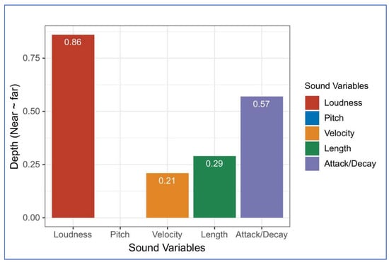 According to the abstract sound variables [], Table 4 indicates the changes in various related information such as language, direction, music, pitch, speed, size, depth, and special effects. This study used sound variables such as loudness, pitch, velocity, length, attack/decay for the matching with depth.