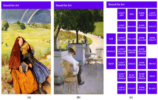 The first step was to analyze the images of the whole work. The specific method was to use software such as Photoshop to divide the artwork into specific grids (e.g., 15 × 19 or 12 × 15) and analyze the name, color, and depth of each object along with the artwork introduction. The analysis selected a specific name, color and brightness level, and depth level. The second step was to create an audio file corresponding to the spoken instructions with names for all analyzed objects. The third step was to apply HRTF to each part of the audio file corresponding to the object name to represent the object’s color in 3D sound. The fourth step was to use Adobe Audition audio processing software to perform pitch scaling without time scaling processing and reverberation processing on each part’s voice-described audio file through the lightness of the color and depth levels. The fifth step was to create a mobile application using Android Studio software. The basic making method was to split artworks as buttons in the way described above and add processed audio files to each part. The artworks used in this prototype as examples were John Everett Millais’ “The Blind Girl” and Gustave Caillebotte’s “The Orange Trees.” The prototype application interface is shown in Figure 6. Figure 6a,b shows where the user could apply the 3D sound coding to the artwork for viewing. By clicking on any part of the artwork, the user could access the audio description of the clicked area. Additionally, each voice description used sound coding in this paper. It was possible to obtain information about color, brightness, and depth while receiving the voice description. Figure 6c shows the listening test of the application. The user could perform headphone tests and sound learning in this interface.