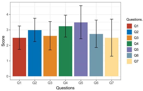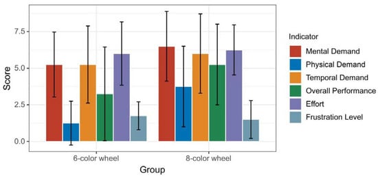 The Official NASA Task Load Index (TLX) is a subjective workload assessment tool that is used in various human–machine interface systems []. By incorporating a multi-dimensional rating procedure, NASA TLX derives an overall workload score based on a weighted average of ratings on six subscales: Mental Demand, Physical Demand, Temporal Demand, Performance, Effort, and Frustration. The scale from 0 to 10 points is chosen for the ease and familiarity of participants, with 0 ranging from very low to 10 being very high. TheTLX test was performed using uniform weights for all metrics. The six-color wheel codes achieved 43.75 points, and the eight-color wheel codes achieved 48.75 points.