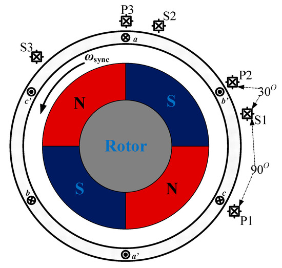 Concept diagram of the direct redundant sensor idea. Sensor mechanical positions are shown for a 4-pole motor.