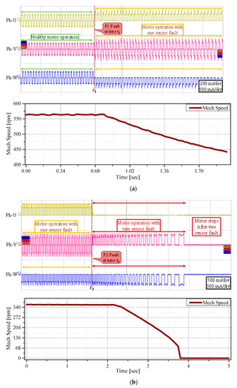 For control of a BLDC motor, a rotor position feedback device is essential. Therefore, for various applications, Hall-effect sensors are used. Under normal operation of the motor, Hall-effect devices provide the required rotor position information, however, in the aftermath of sensor failures, this information is lost and the motor cannot continue the regular operation. Figure 2a shows the motor response when one of the Hall-effect sensors is damaged and Figure 2b shows the motor phase currents after the malfunction of two Hall-effect sensors. Hall-effect sensor, P1, fault causes the motor speed to drop from 563 rpm to 358 rpm, which is 36% reduction in motor speed. Furthermore, the current amplitudes approximately double while Phase-U and Phase-W only conduct unidirectional currents. Figure 2b shows that motor stops completely after two Hall-effect sensors, i.e., P1 and P2 malfunction and remain zero permanently. A double sensor fault causes the Phase-U leg of the bridge to not gain any signal at all, and thus, Phase-U current remains zero permanently. Therefore, after Hall-effect sensor faults, a FTC system is required to sustain the motor operation. A double Hall-effect sensor fault here is assumed that sensor faults occur in succession, i.e., Hall-effect sensor P1 malfunctions at time and Hall-effect sensor P2 faults later on at time during the motor operation, such that there is time for P1 to be remedied.