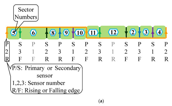 Fault detection and identification logic for Hall-effect sensor P1 is explained and the possible fault cases of one sensor fault are shown in Figure 3. Figure 3a shows the healthy Hall-effect sensor P1 with respect to the rest of the sensor transitions. The first sensor fault is detected mainly by three conditional statements in the main program. Condition-one (conditions are described later in Section 3) compares the speed computed by the edges of the Hall-effect sensor P1 to motor speed computed in sector-5, as shown in Figure 3b. Motor speed is calculated by the equations.