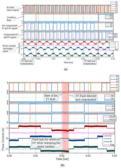 Figure 11 shows experiment results of the multiple sensor fault and compensation. Figure 11a shows the overall response of the system to the double sensor fault, while, Figure 11b shows the zoomed view of P1 sensor fault, detection and compensation. Hall-effect sensor P1 remains zero permanently and is detected by the following edge of Hall-effect sensor S2. From the instant of the fault and to the detection of the fault, the motor currents are incorrect and wrong commutation lasts for electrical 30°. Afterwards, the motor currents are compensated and regular motor operation continues. Hall-effect sensor P2 fault response is similar, therefore, is not shown as zoomed view. A fault where Hall-effect sensor P1 or P2 may remain 0 or 1 permanently, will result in similar system response as shown in Figure 11. Figure 11b show that due to the fault Phase-V conducts for electrical 150° while Phase-W conducts for electrical 210°. Transient currents last till the fault is compensated. FTCP1 is the controller generated compensation signal to replace Hall-effect sensor P1. Figure 11b shows that the fault causes the FTCP1 signal to have a low that lasts for electrical 210°, while the high lasts for electrical 150°. However, after the compensation, the signal periods become normal and symmetric.