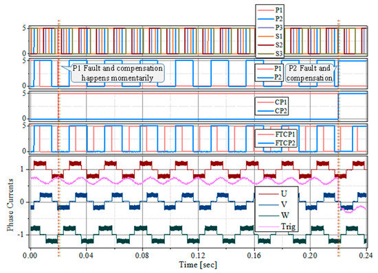 A fault that causes the speed reading to be recorded more than double, compared to the last sector speed, is detected momentarily and does not cause any incorrect commutation. Moreover, motor phase currents show no signs of fault, as if fault never happened. The experimental results are shown in Figure 12. P1 and P2 sensor faults cause a sudden sharp increase in the motor speed within a very small electrical rotation. Thus, the fault is detected and compensated momentarily.