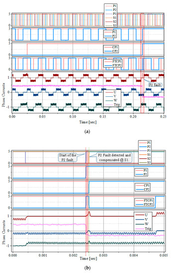 Hall-effect sensor P2 transition after P3 and before S1: (a) P1 and P2 faults are shown, where P1 fault is similar to Figure 11; (b) P2 fault is shown as zoomed-in.