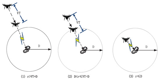 r denotes the horizontal distance between the serving UAV and the user, and V the UAV flying speed. Based on the above flying scheme, there are three outcomes of the horizontal serving distance, , as illustrated in Figure 2: