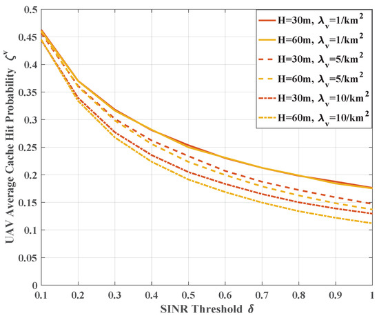 - Compared with the other two caching strategies, our proposed optimal caching strategies for SBSs and UAVs can improve the average cache hit probability. Furthermore, this improvement is more obvious in the scenarios where a larger SINR threshold is required.