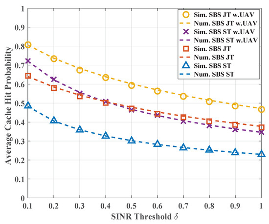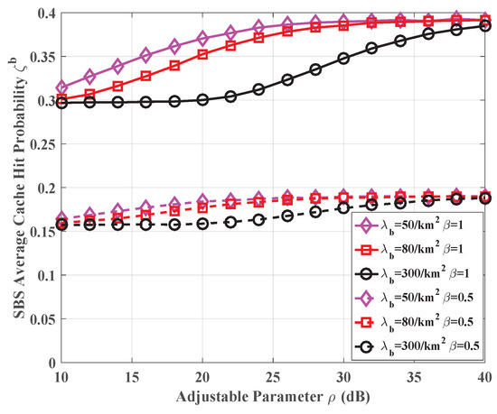 - Interestingly, from the figure, increasing the density of SBSs does not bring any performance improvement but degrades the cache hit probability in many scenarios, which is counterintuitive. The reason behind this phenomenon lies in the ST range determined by the adjustable parameter . As the SBS density grows, the probability of users located inside the range and using ST increase, as shown in Equation (12). Hence, from the perspective of the cache hit probability, the lower averaged SINR performance due to fewer users served by JT leads to the degradation of .