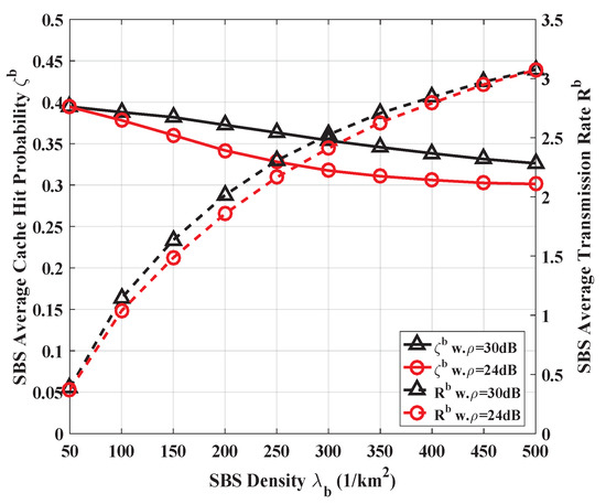 - Thirdly, to balance the performance of the user’s cache hit probability and transmission rate achieved, the density of SBSs has to be carefully chosen. If the SBS density is extremely high, a careful adjustment of is another way to avoid the decline of the cache hit probability.