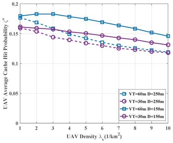 - Firstly, with the increase in the UAVs’ density, the average cache hit probability generally decreases. The reason is the good propagation environment of UAVs. That is, when the UAVs become denser, the aggregated interference grows even faster than the signal power due to the slowly decaying interference caused by the good propagation environment. Similar results have also been reported in [26].