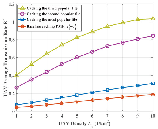 - According to the previous analysis, UAVs caching the most popular files will greatly improve the cache hit probability, but from this figure, the transmission rate will degrade severely. Therefore, the cache scheme of UAVs should be carefully chosen in order to provide a sufficient transmission rate to users. Caching the most popular one might not be a good choice, especially for the low-density UAVs.