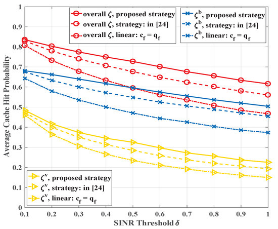 In Figure 10, we compare the average cache hit probability, , achieved by our proposed strategy with other two different strategies: (1) the linear caching probability and (2) the hybrid caching strategies proposed in [24]. From the figure, we can observe that:
