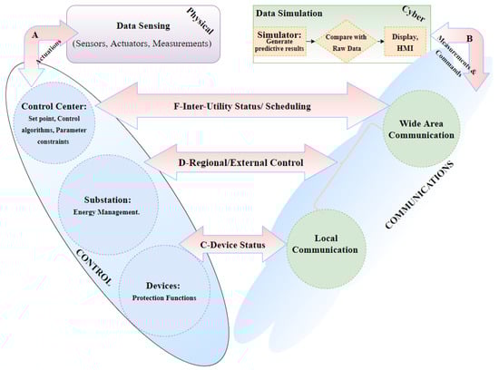 A typical end-to-end CP-SG architecture consists of three main layers: the SG application layer, the power or physical layer, and the communication layer [9,10,11]. The physical layer can be divided into two sub-layers including the physical structure that hosts the external system being controlled and the smart connection of sensors-actuators. The application layer provides all CP-SG applications and services that interface between the CP-SG and human operators. The network layer provides a communication environment for transmitting the data collected from the surrounding environment and thus actuates on a prescribed physical system, while the cyber-layer is responsible for producing the decisions and providing the communication structure for the CP-SG [11].