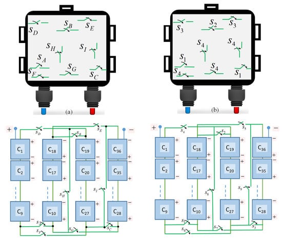 Figure 3. Junction box and the corresponding actual connections of the proposed switches (a) by implementing nine switches (labeled S A , S B , ... S I ) and (b) by replacing them by only four switches to maintain the same function.