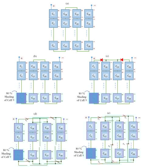 Our proposed PV modules had the advantage of controlling the PV cells’ internal connections to vary the performance of the PV module. Eighty percent shading was applied to one of the cells ( C 9 ) to validate our proposed PV module’s potential. The cases were carefully selected to start from normal system operation (without any shading) and apply the given modes above to assess the PV modules’ operation when one cell was 80% shaded.