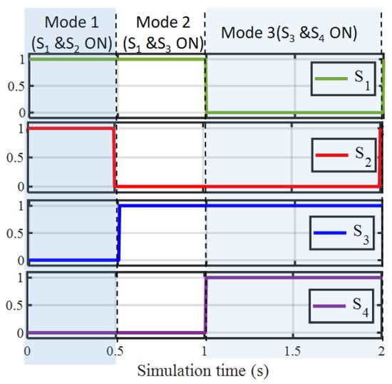 The proposed PV modules in this article were modeled based on the switches’ states that connected/disconnected the PV strings. Therefore, parallel and/or series strings could be formed, resulting in a wide range of voltage and current values. When the strings were connected in series, a higher voltage was achieved, while when they were connected in parallel, a higher current was achieved. Using this technique, the current and the voltage could be controlled to meet the load requirement. For each scenario of the string connections, we tracked the current–voltage characteristics of the proposed PV modules and compared their performance with the conventional modules with and without shading effects. MATLAB Simulink® was used in this article to prove the concept of the proposed model of the PV modules. From the current–voltage characteristics, the open-circuit voltage, the short-circuit current, and the maximum-power point values were extracted. The switches were controlled as explained in Table 1, and their instantaneous states are depicted in Figure 6. Passive switches were used in this work to mitigate the risk of any circuit failure. In fact, the four switches could be simplified into two single-pole double-throw (SPDT) switches. The switches S 1 and S 2 complemented the corresponding states of the switches S4 and S3, respectively. Therefore, S 1 and S 4 could be combined as one SPDT switch, while the switches S 1 and S 4 could be combined as a second SPDT switch. At each time slot, the states of the switches determined which cells were to be connected. Figure 7 shows the complete model, consisting of 36 identical cells except cell 9, which was 80% shaded. The simulation of the PV module for the five cases is depicted in Figure 8, which was done to extract the corresponding electrical parameters from the current–voltage characteristics in every case. As a figure of merit to compare the power losses due to shading, we assumed the power P ( m a x , C a s e ( a ) ) in case (a) as a reference for the calculation power losses as follows: