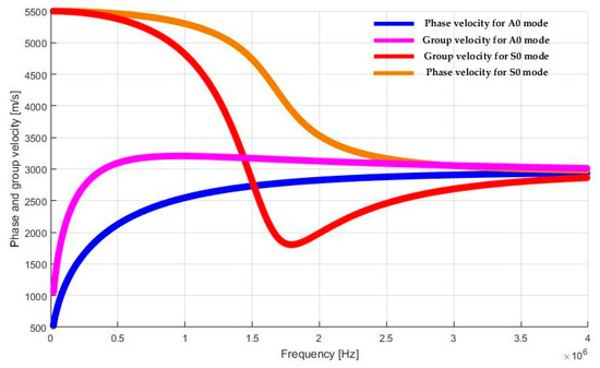 Dispersion curves of the group velocity (bottom) and phase velocity (top) of the 0 order modes of Lamb waves in a homogeneous aluminum plate with thickness 1.4 mm.