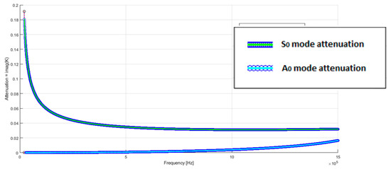 Simulation of the attenuation of the order S0 and A0 modes of the Lamb waves for a 1.4 mm thick aluminum laminate.