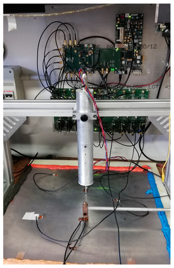 To validate the whole system, we organized an experiment with four PI sensors installed on the aluminum plate in different positions, and an impact in a known position was carried out with a free-falling sphere with an impact final velocity of 1.2 m/s. The four AFE modules were programmed for CH3 and no attenuation at the input.