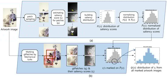 Figure 1. Two processes to build our saliency-based patch sampling scheme: (a) building the distribution of saliency scores for an input artwork image, (b) building the distribution of saliency scores for a gtPatch.
