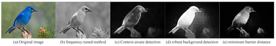 31. Zhang, J.; Sclaroff, S.; Lin, Z.; Shen, X.; Price, B.; Mech, R. Minimum barrier salient object detection at 80 fps. In Proceedings of the IEEE International Conference on Computer Vision 2015, Santiago, Chile, 7–13 December 2015; pp. 1404–1412. [Google Scholar]