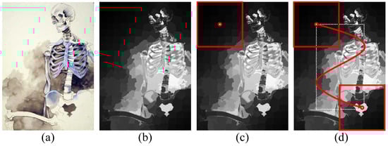 Figure 3. Process of computing the saliency score of all patches of an image. (a) input artwork image, (b) corresponding saliency map, (c) saliency score computation for a patch with a size of 256 × 256, (d) saliency score computation of all patches inside an input image.