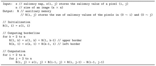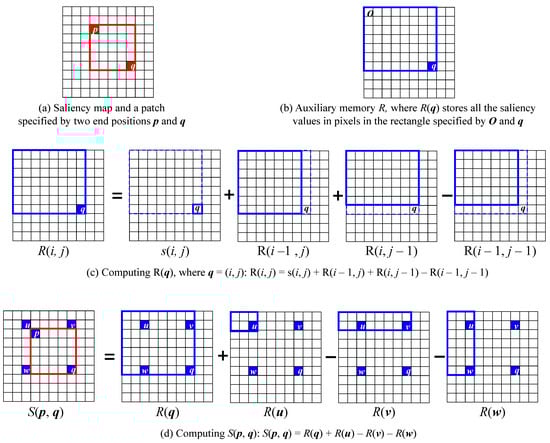 For efficient estimation, we use a cumulative summation scheme with an auxiliary memory R of size n × n . R ( q ) , where q = ( i , j ) , stores the sum of the saliency values in a patch defined by O and q, where O is the origin of the image. From s ( x , y ) , the saliency values at a pixel ( x , y ) , R ( i , j ) is computed by the following formula: