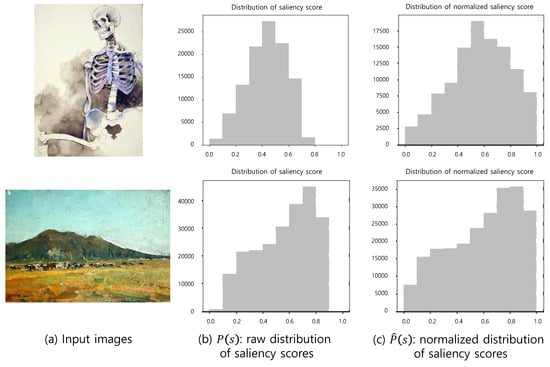 where s m a x and s m i n denote maximum and minimum saliency score, respectively. The raw distribution ( P ( s ) ) and normalized distribution ( P ^ ( s ) ) of saliency scores are illustrated in Figure 6. We use the normalized distribution.