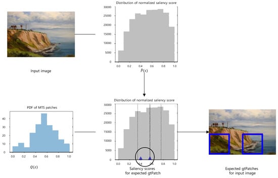We analyze the distribution of the saliency scores of the gtPatches sampled from an artwork image and determine the relationship between the saliency score and patches. Figure 8 illustrates an example. The saliency scores of the gtPatches are marked in the histogram of the saliency score distribution, and in this example, they are located between q1 and the median of the distribution.
