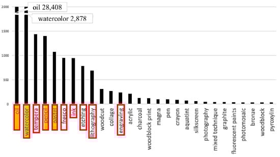 Figure 13. Frequency of the most frequently used media type from WikiArt: Yellow box denotes the media contained in YMSet+ and Wiki4, and red rectangle denotes those in Wiki10.