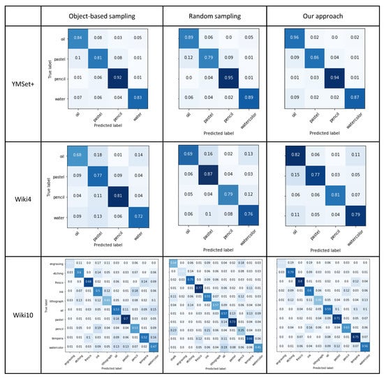 Figure 19. Comparison of confusion matrices: Row denotes the dataset and column denotes sampling strategies.