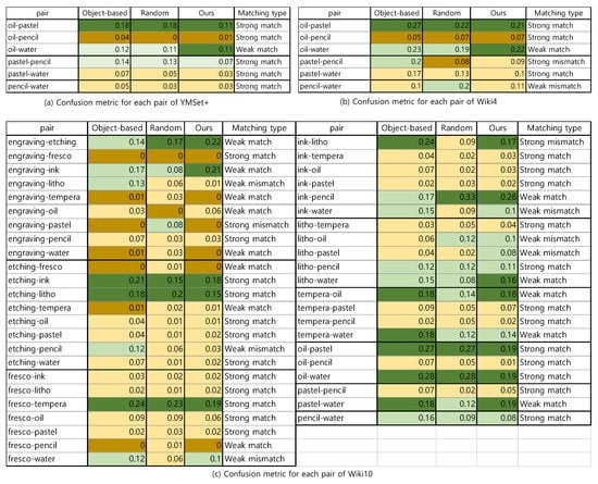 Figure 21. Confusion metrics and their matching types for each media pair from the three datasets and three sampling schemes.