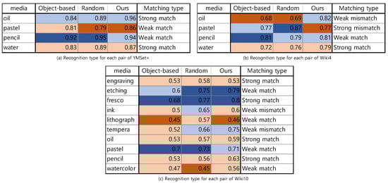 Figure 23. Recognition metrics and their matching types for each medium from the three datasets and three sampling schemes.