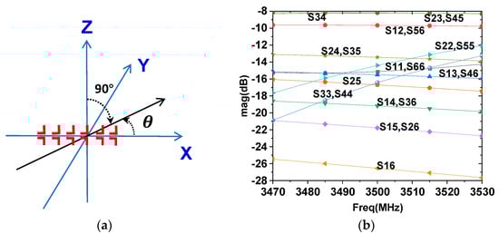 In this paper, we examine DoA with a 6-port ULA of half-wave V-pol dipoles as a receiver (Figure 1a). We assume that the propagation environment is Line of Sight (LoS). The element spacing is at the frequency of this study (f = 3.5 GHz). The antennas are also designed at the frequency of 3.5 GHz and the magnitude of all the S-par matrix elements of the ULA is below −8 dB (Figure 1b). The azimuth of signals is from the angular range of . The elevation angle is fixed at in all simulations and we simply estimate the azimuthal angle.