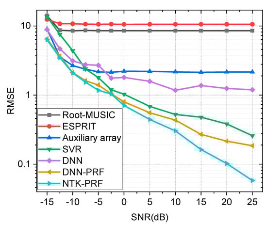 Figure 2 depicts the performance comparison of different methods versus SNR. Root-MUSIC and ESPRIT can achieve high-resolution angle estimation with known array manifold. In the presence of unknown mutual coupling, however, their performances are severely degraded. The auxiliary array method can effectively reduce the effect of mutual coupling in the Toeplitz structure. However, the realistic electromagnetic mutual coupling included in the data here does not follow the Toeplitz structure. Thus, the performance of the auxiliary array method is not that well suited for this problem. SVR and DNN are very time consuming as they update parameters such as weight and bias at each iteration. The SVR method maps the upper triangle of the covariance matrix to the estimated angle. Although it has good estimation performance, its generalization to incoming signals from multiple angles is weak. In the DNN method, an auto-encoder preprocesses the original array outputs to reduce the distribution divergences of the input data first. Then, multilayer classifiers following a one-versus-all classification guideline are introduced to estimate multiple incoming signals. However, the estimation accuracy is reduced in the case of multiple incoming signals. The estimation error is relatively large especially when the angle of the signal is close to the axis of the array (i.e., 0 degrees) or close to the boundary of the training data angle space. The DNN-PRF here uses 50,000 iterations and only 64, 32 and 16 neurons in layers 1, 2 and 3, respectively. The NTK is derived as the limit of a neural network with infinite layer width and iterations, and is not an iterative algorithm. Hence, not unexpectedly, the NTK-PRF is more accurate than the DNN-PRF. The discrepancy is actually higher at lower SNR values. NTK-PRF method proposed here has better performance than each of the baseline methods in the presence of mutual coupling.