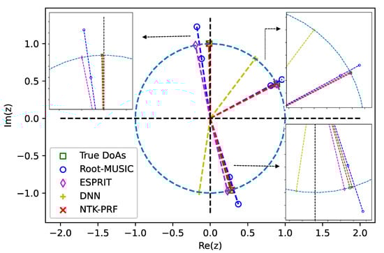 The roots, (see Section 2.3), are shown in Figure 3. Three sources are considered at 5 dB SNR. The multiple complex root pairs, and , have the same phase and reciprocal magnitude, one zero is within the unit circle and the other outside. As the detailed insert in Figure 3 shows, NTK-PRF method has higher estimation accuracy when sources are far apart.