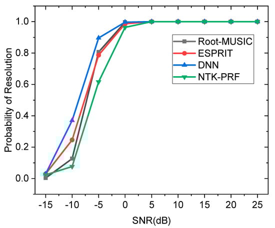 The probability of resolution is the probability that the algorithm can identify the two closely separated sources. Assuming that the true angles of two incident signals are and , the estimated angles are and , respectively. If both and are less than , the two signals are considered successfully resolved. When the two sources are very close together, mutual coupling results in high estimation error. In Figure 4, we plot the probability of resolution versus SNR for the different methods. The two incident signals with and are relatively apart, in order to obtain the successful estimation. The statistical performance is evaluated by performing 300 Monte Carlo runs for method. The results show that the proposed NTK-PRF has relatively low resolution probability compared to baseline methods, when two sources are close.