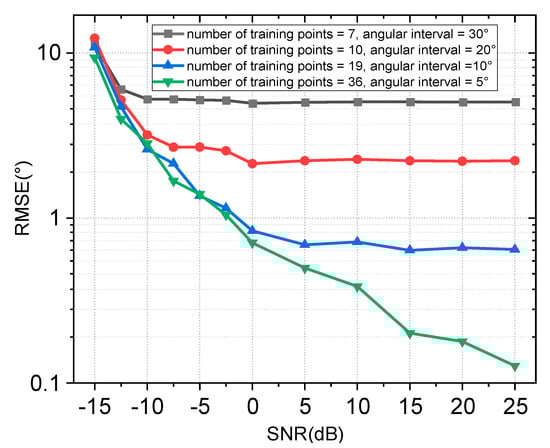Numerical simulation results of the DoA estimation illustrate the performance of the proposed method against the baselines. In the NTK algorithm, we use a DNN with hidden layers and the ReLU as activation function of each hidden layer. We also consider 1000 different positions of the Tx (i.e., 1000 different DoAs), uniformly distributed in space. The sensor data is then generated using Equation (2), and the covariance vectors of data sets are obtained from = 1000 snapshots with random noise. A small number of uniformly selected DoAs are chosen as the training (or calibration) dataset while all the DoAs are used as the “test” dataset in order to test the performance of each algorithm. The Root Mean Square Error (RMSE) between the estimated DoA angles and the true DoA angles is used as the performance metric for each of the DoA estimation algorithms considered, which is defined as