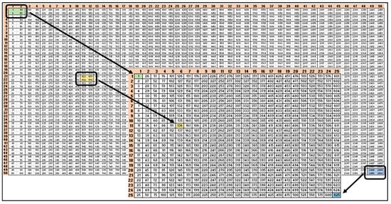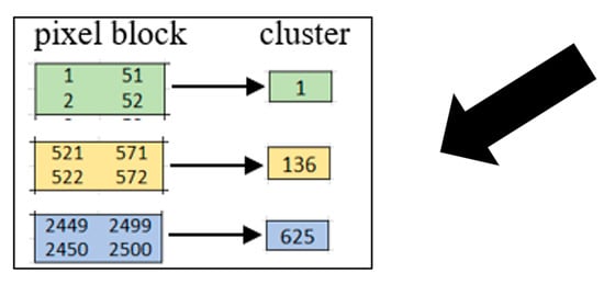 In this research, a CNN-based supervised learning algorithm was adopted for image reconstruction which established a mathematical model of mapping the input of 66 resistance measurements to the desired output pixel pattern [38]. The resulting image was meshed into a 50 × 50 pixel grid, and the pixels were equally spaced. These 2500 pixels were sorted first by row and then by column. As such, in the first column and from the first row to the last row, the pixels were numbered from 1 to 50. Then, in the second column and from the first row to the last row, the pixels were numbered from 51 to 100. Following the same rule, the pixels in the last column from the first row to the last row were numbered from 2451 to 2500. If a single CNN were used to image the entire 2500-pixel image, there would be pixel distribution classes for the CNN to classify, which would be almost impossible for training. The problem was solved by dividing the 50 × 50 pixel image into a 25 × 25 pixel image with non-overlapping clusters, with each cluster representing a 2 × 2 pixel block. Since the space of each pixel point on the image was the same, the space of the clusters was also the same among each other. The conversions between pixels and clusters can be viewed in Figure 2. The clusters were also sorted first by row and then by column. Thus, taking cluster 1 as an example, it corresponds to the area of pixel 1, 2, 51, and 52.