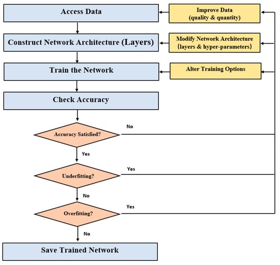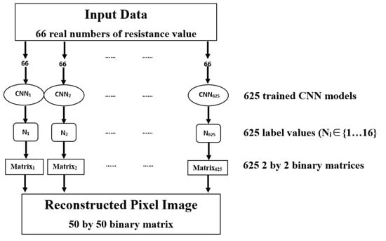 Then, the image reconstruction could be realized by the conversion process via the 625 CNN models, as shown in Figure 3. The 625 CNN results were converted into 625 2 × 2 binary matrices, based on Table 1, and the conversion between cluster patterns and the final pixel image took the reverse of the conversion from pixel to cluster, as explained in Figure 2, to form the final 50 × 50 pixel image. The development of each CNN followed the general procedure of the deep learning method as shown in Figure 4, which mainly included accessing data, constructing network architecture, setting training options, and conducting training, along with hand-tunings to achieve a fitting model.