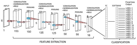 The CNN layers were constructed with the aid of the deep network designer application MATLAB R2020b, MathWorks.Inc, USA. After hand-tunings, the 625 CNNs adopted the same 19-layer architecture to realize feature extraction and classification, and the network architecture is displayed in Figure 5. In this work, hand-tuning of the hyperparameters included the following: (1) tuning the hyperparameters related to the network structure, such as the number of hidden layers and units and the activation function, and (2) tuning the hyperparameters related to the training algorithm, such as the optimizer, initial learning rate, number of epochs, and batch size. For different cases, the hand-tuning was different, but the trade-off needed to be considered alongside the training to avoid underfitting or overfitting cases. Convolution layers functioned as feature extractors by executing convolution operations between the receptive fields of the input and the kernels. An activation function—the rectified linear unit (ReLU)—introduced nonlinearity to the network via Max pooling performed nonlinear downsampling on each feature map by taking the max value of the feature block to reduce computation while keeping essential information and providing invariance to the local translation. Batch normalization improved the stability, performance, and speed of the network. The fully connected (FC) layer flattened the 3D features into a 1D vector for classification, and the softmax layer calculated the probability of the input data belonging to each class. The distribution of 16 pattern classes was unbalanced. After randomly sampling the different cases, Table 2 shows the 16 classes’ distribution for all sampled cases. Though the number appearing for each class may have varied with the added noise, class 1 and class 16 accounted for the majority of the possibilities. Thus, the focal loss layer was critical, since it was applied as the output layer to deal with the data imbalance between classes. The details of the CNN layers and parameters are given in Table 3.