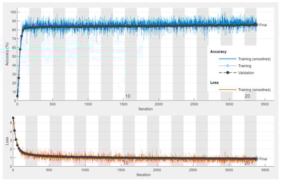 The training was carried out on each CNN separately through the BP algorithm and Adam optimizer in order to find the most suitable weights and bias for the model, which could result in minimal prediction cross-entropy loss. The simulation dataset was randomly divided into training data, validation data, and test data at a ratio of 80%:10%:10%, respectively. The ‘initial learning rate’ was set as 1 × 10−5, ‘MaxEpochs’ was 20, ‘MiniBatchSize’ was 50, the validation frequency was 20, and the rest of the configuration parameters were set to the default values. The optimization process went through a maximum of 3380 iterations before reaching the final convergence. For these 625 CNN networks, the minimum validation accuracy after training was 85.6% and the average validation accuracy was 94.4%. The number of clusters with a validation accuracy above 90% was 536, accounting for 85.7% of all clusters. Figure 6 displays the training progress plot generated by MATLAB R2020b, MathWorks.Inc, USA, for the cluster, which was the hardest one to reconstruct as it was located in the center of the sensing area. Due to the characteristic of the soft field, the sensitivity in the center area was lower than that near the sensor. In Figure 7b, the validations and test accuracies of the other clusters are also shown. The selected demonstration clusters were positioned at the midline of the vertical axis with the same space. Figure 7a shows the position of the selected cluster with red squares, and the corresponding clusters are the 63rd, 188th, 313th, 438th, and 563rd clusters. From the results, it can be seen that the cluster near the sensor area would have better CNN performance. In Figure 6, the deep blue curve and black curve in the top image represent the training accuracy and validation accuracy, respectively, and the orange curve and black curve in the bottom image represent the training loss and validation loss, respectively. With the growing training iterations, the accuracy curves increased gradually, achieving over 85.6% accuracy after training, while the loss curves decreased. Based on the tendency of the curves, it could be regarded as a good-fitting network. Besides that, the accuracy of the test dataset for the cluster reached 85.93%, verifying the generalization ability of the model.
