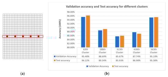 (a) Cluster grid and the selected clusters (marked with red squares). (b) Comparison of the selected clusters for validation and test accuracy.