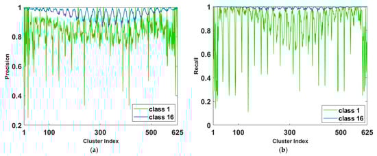 The plot of the (a) precision and (b) recall values of 625 CNN networks for class 1 and class 16.