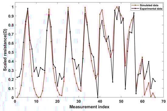 Comparing Table 4 and Table 5, for each case, the SNR value by the CNN for experimental reconstruction was lower than that of the simulation reconstruction due to the random noise and interference during measurements. Besides that, the effect of scaling also amplified the differences. Taking case 1 as an example, Figure 10 plots the 66 scaled resistance measurement data of the simulation and experimental tests. Both reasons led to a decrease of the SSIM and increase of the MSE in practical reconstruction. Even so, Table 5 shows that the CNN can be well applied for real data to reveal the relative size and position of the plastic rods, with an average SSIM of 0.7846, average MSE of 0.0408, and average PSNR of 14.3733, which indicates that our networks did well in terms of noise tolerance. The average SSIM, MSE, and PSNR for the TV method were 0.7947, 0.0436, and 14.1732, respectively. Figure 11a–c shows the comparisons of the SSIM, MSE, PSNR values via the CNN and TV methods.