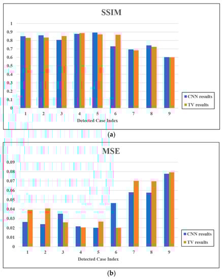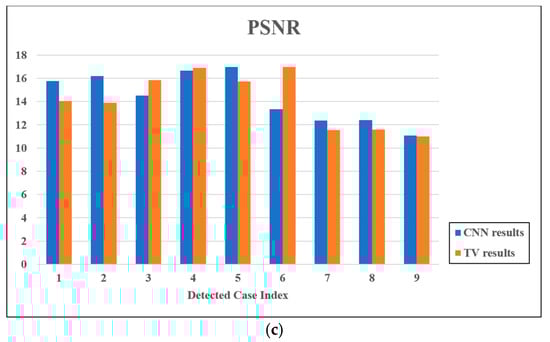 (a) SSIM (structural similarity) plot (b) MSE (mean squared error) plot (c) PSNR (peak signal-to-noise ratio) plot for 9 reconstruction cases by CNN and TV (total variation).