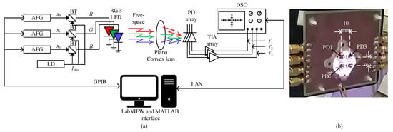 The experimental block diagram is shown in Figure 1. LabVIEW was used to control both the arbitrary function generators (AFGs, Tektronix AFG3252) and digital storage oscilloscope (DSO, Keysight DSO9254A) via GPIB and LAN connections, respectively. Three independent pseudo-random binary sequences (PRBS) (xR, xG, xB) of length 210−1 were uploaded onto the separate channels of the AFG’s via the GPIB interface for intensity modulation of each of the RGB chips via a bias tee. A bias current IB of 300 mA was applied to each LED chip through the laser driver (LD) to maintain constant illumination. Following, free-space transmission through a 75 cm LoS channel, at the Rx a 10 cm plano-convex lens was used to launch the light beam onto the PD (Osram OSD15-5T) array (Figure 1b), the output of which was AC coupled to transimpedance amplifiers (TIA, AD8015). The regenerated electrical signals Yk were captured using the DSO and then uploaded to the PC via the LAN cable for off-line processing. Using MATLAB, the signals are low-pass filtered (LPF) at the bit rate RB, prior to being processed into either the CSI coefficients or demultiplexed into estimates of the transmitted data. For the experiments, RB of 5 Mb/s per channel was chosen, as this lies comfortably within the LED Bmod.
