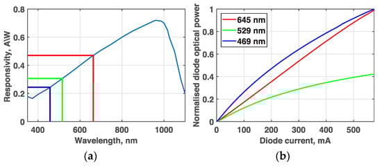 where m is Lambertian order of emission of the LED, A is the PD’s active area, d is the transmission distance, and φ and ψ are the angles of irradiance and incidence, respectively. g(ψ) is the gain of the optical concentrator. Ψc represents the field of view (FOV) of the PD. The plot of the Si PD is depicted in Figure 2a, with the R (645 nm), G (529 nm), and B (469 nm) components highlighted at 0.45, 0.32, and 0.26 A/W, respectively. Figure 2b illustrates the normalized optical power as a function of the drive current for all three LEDs. It shows that R and B LEDs have similar current to power conversion profiles with the B LED exhibiting less linearity. The G LED exhibits a lower conversion efficiency and a non-linear behavior compared to the R and B LEDs.
