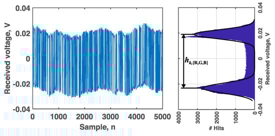 Each of the CSI coefficients in this system is estimated by transmitting the PSs over a given time t and logged as the time-averaged amplitude. Note that the CSI coefficients are extracted using the double Gaussian curve fitting in MATLAB over a histogram of the received PS and by finding the amplitude between the maxima (Figure 3).