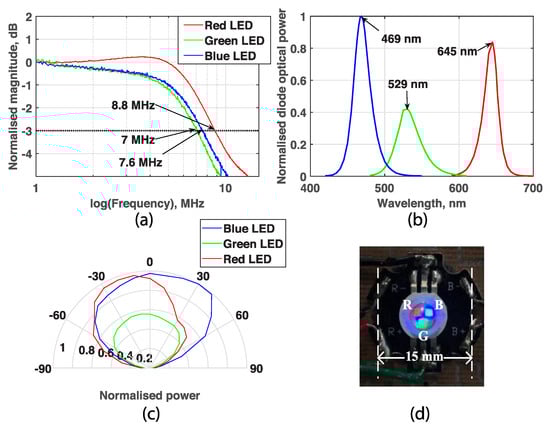 The LEDs used for the RGB D-MIMO link have been characterized, as shown in Figure 4a–c, for the frequency response, relative spectral output and optical beam profile, and in Figure 2b for E/O conversion. The normalization factor in Figure 2b and Figure 4b,c have been set using the maximum output power levels at the peak wavelengths of 469, 529, and 645 nm. The frequency response was measured using an Agilent Technologies MXA Signal Analyser (N9020A). Each trace was normalized to 0 dB at the minimum test frequency of 1 MHz. The measured 3 dB bandwidths are 8.8, 7.6, and 7 MHz for the R, B, and G LED chips, respectively. The relative spectral profiles shown in Figure 4b display adequate isolation between wavelengths with a slight overlap between B and G LEDs. The RGB beam profile (Figure 4c) shows that both the B and R beams are skewed to the right and left, respectively, whereas the G beam is centered to the normal. Skewing of the B and R can actually assist in the diversity of H matrix rows, given that CSI is also dependent on the irradiance and illuminance angles (φ, ψ) as described in (4). Figure 4d highlights the relative positions of the colored chips on the LED die. The LED has a dome lens covering it, which could explain the skew experienced by the R and B wavelengths since they are both positioned off-center.
